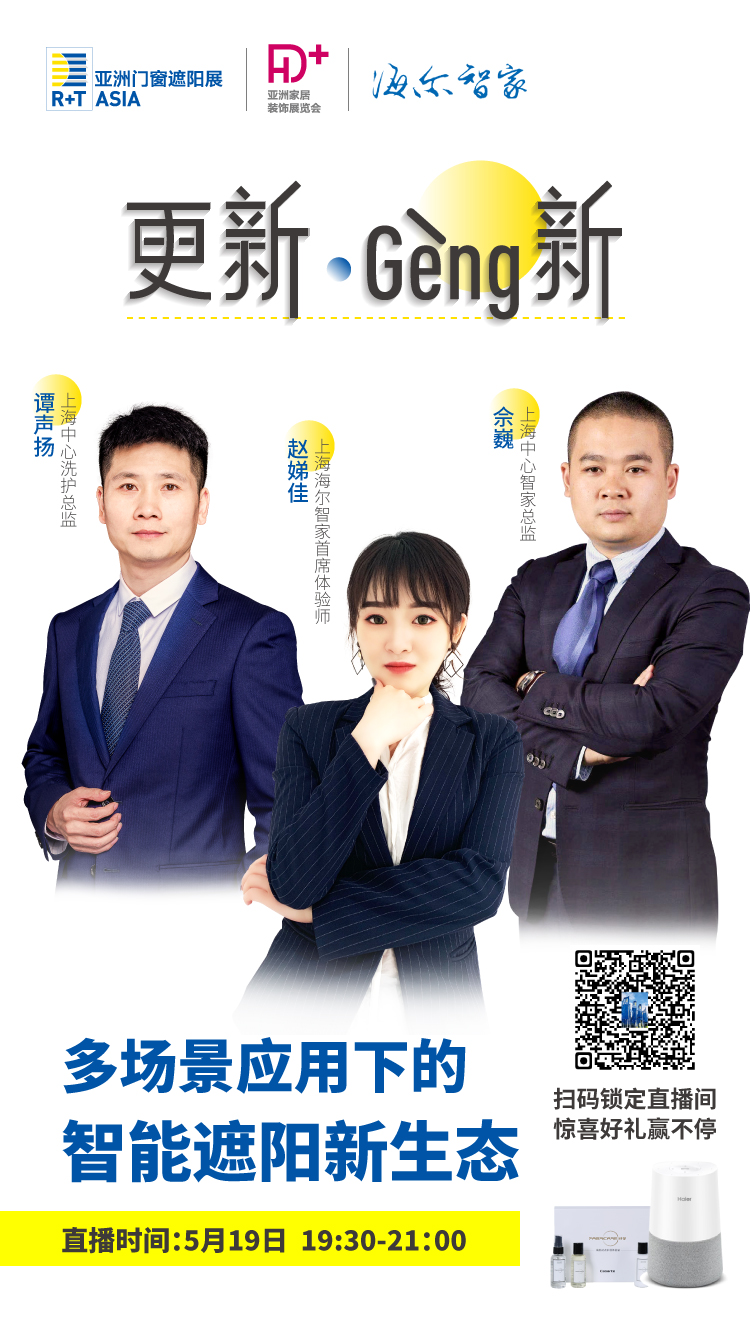 R+T&HD+Asia亚洲门窗遮阳展及亚洲家居装饰展“更新·Gèng新”线上商学院系列首场直播正式开启,海尔智家与你共话智能遮阳新生态。
