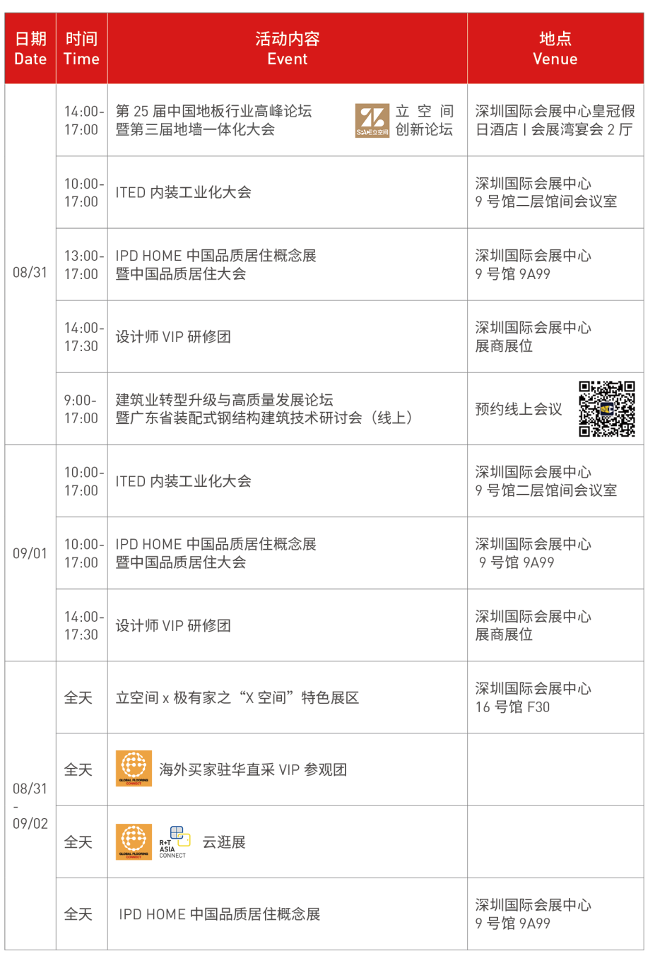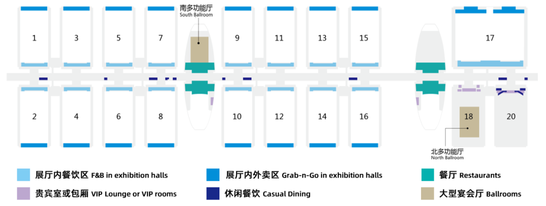 展馆地址 深圳国际会展中心 地址:宝安区福海街道展城路1号 (南登录大厅东侧 ) 深圳国际会展中心拥有完善的各类餐饮设施,餐饮面积超5.1万平方米(中央厨房面积超1.5万),能提供健康、安全、美味的中式、西式,从茶歇、快餐到大型宴会等多种餐饮服务。 展厅内餐饮区:1-17号展厅第三层均设餐饮区; 展厅内外卖区:1-17号展厅第二层均设外带餐饮区; 餐厅:两个登录大厅第三层设中餐厅、西餐厅、自助餐厅、和包房; 贵宾室或包厢:18号展厅第三层设1个VIP贵宾室;20号展厅第三层设1个VIP贵宾室和8个VIP包厢;两个登录大厅东侧的第二层各设1个VIP贵宾厅; 休闲餐饮:20号展厅第一层和第二层各设2个餐饮服务柜台;中央廊道第一层设14个餐饮服务区; 大型宴会厅:南宴会厅位于南登录大厅西侧第二层;北宴会厅位于18号展厅第一层。 3天时间,4大主题,集产业融合、工程集采、设计应用、国际贸易为一体,全产业上下游联动,内外贸双轮驱动,地产、工程、设计、跨界大咖汇聚一堂。