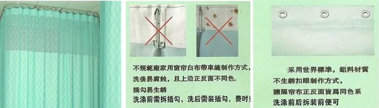 为了便于拆洗,窗帘隔帘上沿布头需采用洗涤后不易生锈的铝合金或不锈钢金属材质鸡眼扣环制作(不采用白布带插勾缝制方式),并于每0.2米制作1个扣环,使用S型钩吊挂,该制作挂扣方式拆洗安装速度较带插勾缝制方式快5倍以上。