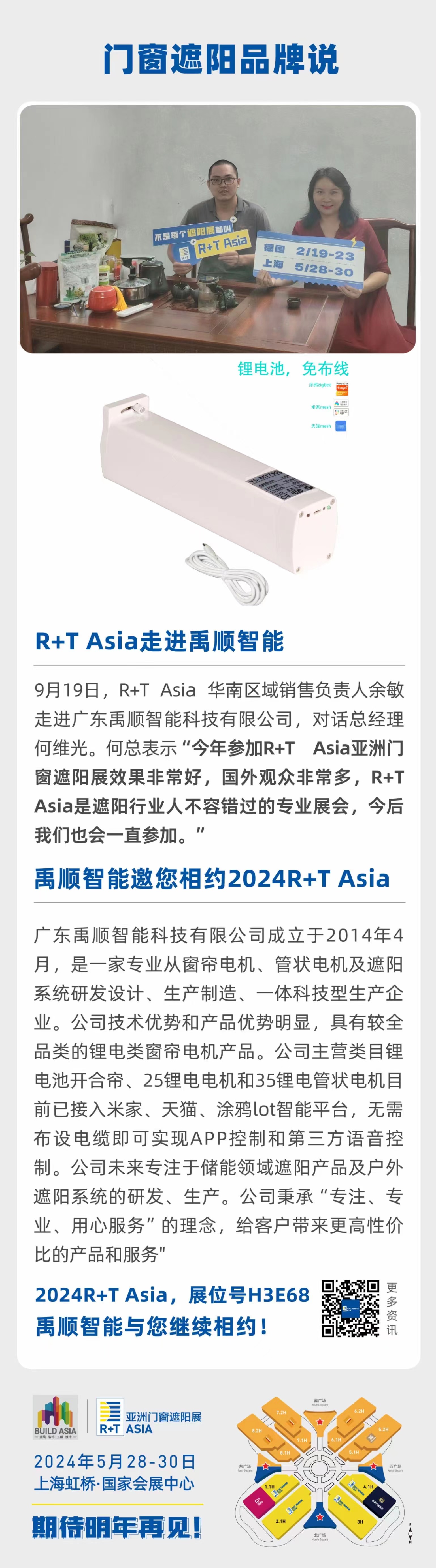 9月19日,R+T Asia 华南区域销售负责人余敏走进广东禹顺智能科技有限公司,对话总经理何维光。何总表示“今年参加R+T Asia亚洲门窗遮阳展效果非常好,国外观众非常多,R+T Asia是遮阳行业人不容错过的专业展会,今后我们也会一直参加。”