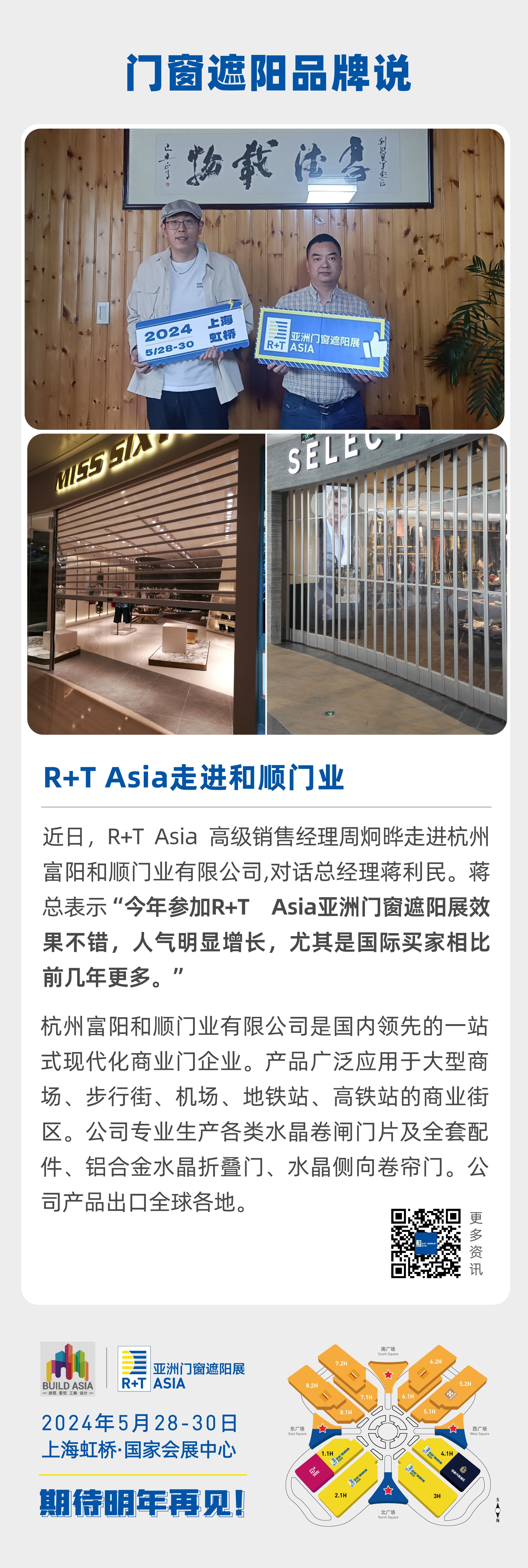 近日,R+T Asia 高级销售经理周炯晔走进杭州富阳和顺门业有限公司,对话总经理蒋利民。蒋总表示“今年参加R+T Asia亚洲门窗遮阳展效果不错,人气明显增长,尤其是国际买家相比前几年更多。”