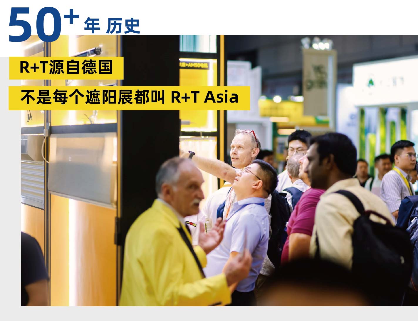 R+T源自德国,母展已有超过50年历史,是全球最大的门窗遮阳展。R+T Asia伴随着行业的万象更新而日趋壮大,已经成为引领行业新品技术潮流、亚太地区最具影响力的行业盛会,亦成为门窗遮阳企业及专业观众一致认可、年度必至的贸易平台。2025年,R+T Asia 亚洲门窗遮阳展将继续携手BUILD ASIA Mega Show亚洲建筑及装饰联展,于上海最大展馆-国家会展中心(上海虹桥)。全面整合硬装、软装、智装全品类,聚焦工程集采、设计及终端应用,以更加可持续的发展共识、更全面的行业整合,在满足观众一站式采购需求的同时,拓宽海内外经销代理渠道,与门窗遮阳企业并肩前行,助力行业升级。