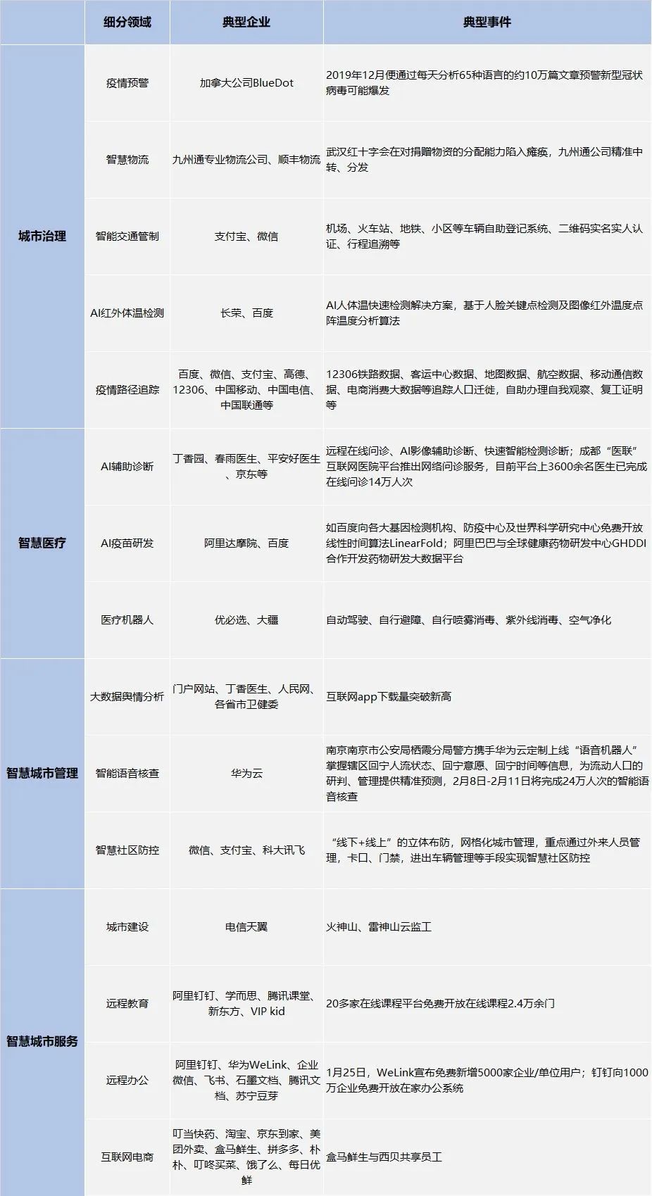 2020年2月10日,上海市发布《关于进一步加快智慧城市建设的若干意见》。再次明确提出智慧城市的未来建设要求。 疫情期间智慧城市已开始实施,上海“一网通办”依托移动端“随申办”,为上海市民打造“随申码”,作为上海市民的生活服务码,方便市民工作、生活、出行等需要,现已正式试点上线。 很明显,这场突如其来的战疫,让当地政府更深刻地意识到了运用科技手段加强疫情防控与治理的重要性。 实际上在疫情之前,各地已陆续开展智慧城市建设步伐。 2019年2月1日,河北省人民政府办公厅印发《关于加快推进新型智慧城市建设的指导意见》,提出加快推进新型智慧城市建设的主要目标。 目前河北建投集团与阿里巴巴签署了战略合作协议。从合作项目来看,阿里巴巴涉及到了河北智慧城市建设的方方面面,尤其是雄安新区智慧基础设施建设、云计算基础设施建设以及精准扶贫等多项工作。 北京城市实验室在2019年暑假做了一个小探索,通过各种渠道对北京近年来看到见的智慧化举措从智慧政务、智慧交通、智慧教育、智慧经济、智慧生活与智慧环境六大方面进行了梳理,并对三个北京场景进行未来设计,涵括未来街道、微型空间与自愈城市,探索北京智慧城市的可能性与延展性。 2019年8月30日,广东省住房和城乡建设厅发布广东省标准《智慧灯杆技术规范》(以下简称《规范》),这也是全国首个针对智慧灯杆的省级标准。《规范》的出台对全面推广5G技术应用,助力智慧城市建设具有重要意义。 ////////// 地方性政府的决策标志着地方智慧城市的觉醒。我们可以看出,从城市正常运转,生活保障,在线学习、协同办公,到疫情期间急需救治患者和床位信息之间的有效对接、医用物资需求和供给之间的有效调配,都必须依赖一个响应灵敏、高效运转的智慧城市平台。 与此同时,城市管理者们也必须要认识到不同城市发展不同,智慧化也会有所差距。根据各城市的发展,建设成为一个统一、集约、高效、智能、快速应变的智慧城市体系。 政府出具政策明细助力各地区智慧城市发展,疫情是挑战更是契机,使企业加速融入智慧城市建设当中。 疫情期间智慧城市功用性得到充分体现,因为城市运转仍在继续,这就必须要依靠智慧城市的大数据平台。很多城市为了避免人员过多流动,减少病毒传播,采取封城、封闭小区,停工、停业、停学和交通工具限行等政策,城市管理者要抓住这个契机,把本来难以在日常应用的新业态开展试点,比如: 无人驾驶 每天还有一些医护人员需要在家庭和医院往返,却不能很好出行,这时就可以通过无人驾驶车辆的部署代为交通工具运送。 无人机 通过无人机为消费者购物提供便利。 医疗机器人 代为巡检、检测体温,运送药品等。 智慧医疗体远程服务 比如物联网监测隔离人士的状况,实现智慧、精准、优质的全流程闭环医疗服务。 疫情期间的数据大爆发虽然给政府部门的疫情防控工作带来了巨大挑战,但是各大科技企业通过信息感知和大数据交互技术,极大地起到辅助政府决策的作用。 为助力各地区疫情的精准防控和分类有序复工复产,在国务院办公厅电子政务办的指导下,阿里充分总结先行地方经验基础上,基于全国一体化政务服务平台,加快研发全国一体化政务服务平台疫情防控支付宝健康码系统。 中国航天科工集团子公司承担了浙江省际疫情检查站点的软件部署及现场设备搭建任务,平均每天监测车辆3000多台、9000余人次,发挥了智慧检查站助力疫情防控的作用。 又如,携住科技针对“新冠”接触式传播途径,结合酒店特点,对酒店梯控进行智能化升级改造,通过引入AIoT技术应用,实现刷脸呼梯和楼层自动选择功能,减少住宿感染风险。 移康智能可视门铃系统 再如,上海闵行经委用移康智能可视门铃系统设备来预防疫情传播,通过AI和大数据实现了辖区内“点对点”的布控管理,不仅实现了居家隔离外出的“秒报警,零接触”,还大大节省了人力物力。 还有更多智能企业奔赴建设前线,在城市治理、智慧医疗、智慧城市管理、智慧城市服务上助力疫情下的智慧城市建设。 资料来源:深圳中原产业专业组整理 可见,疫情对于企业而言,既激起了众多智慧城市产业链企业参与“抗疫”的热情,也让一批嗅觉敏锐的企业捕捉到了加快涉足智慧城市建设的商机。 正所谓大势将至,未来已来。可以看到的是,智慧城市的发展,将以我们所未预见的方式,按下快进键。在这场没有硝烟的战争中,日趋完善的产业体系、厚积薄发的科研实力、先进的科学技术,正成为战“疫”的强力武器。
