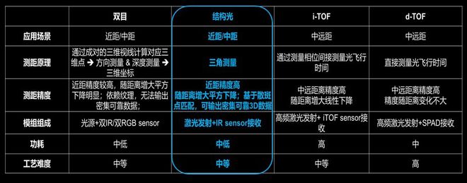 结构光基于三角测量原理实现三维成像,主要由激光发射端、接收端以及深度引擎芯片等组成。在测距时,激光发射端可向三维空间投射数万个散斑点,以对三维空间进行编码;接收端用于接收空间编码信息,并输入到深度引擎芯片解码计算,最终输出3D信息。