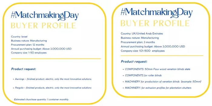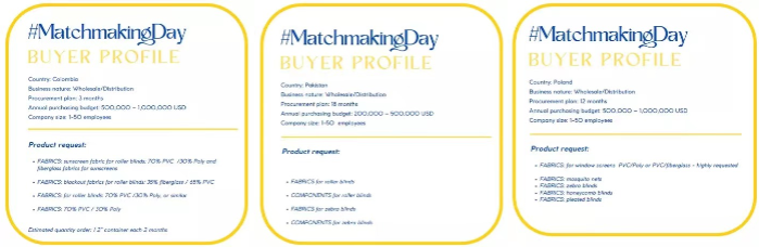 本次遮阳及面辅料专场线上采购会将于2022年3月举办。目前,已有来自美国、英国、澳大利亚、西班牙、葡萄牙、阿联酋,沙特阿拉伯、白俄罗斯、印度等多国买家积极参与,并提供具体采购产品需求。