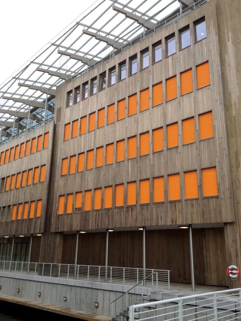 Hall介绍称,该建筑外立面的65%装有玻璃,玻璃内外两侧都安装了自动调控百叶窗,室内部分的百叶窗还可供个人手动控制使用以及进行遮光度调节。“配合其他节能技术,该建筑的年平均能耗约为40千瓦时/平方米,截至今日这栋建筑仍然是瑞典最节能的办公楼之一。”