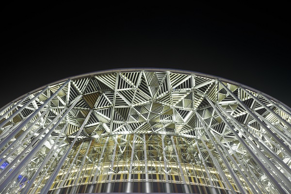 在剧院的入口处,一系列柱子呈一定的角度与屋顶天蓬上的金色铝制百叶窗连接在一起。看上去就好似竹林顶部的“叶子”,造型优雅的百叶窗支撑在细长的立柱上面,同时也将重量传输到建筑的主要结构上面。圆形剧场的四周覆盖着带有白色和金色条纹的玻璃幕墙,这与周围的白色圆柱体相映成趣。到了夜晚,整个剧院会因为灯光经各种明亮表面反射后变得闪闪发光。