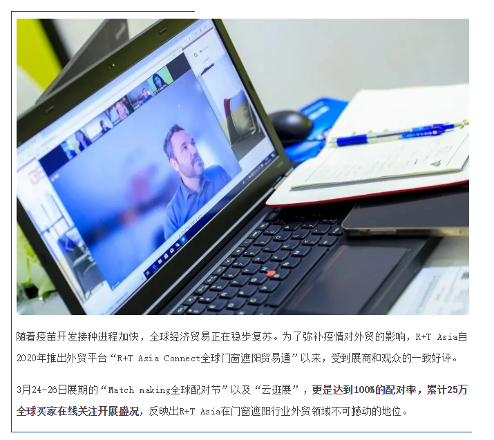 R+T Asia是行业内最专业且规模最大的展会,温多利与R+T Asia一路走来,彼此都非常信任。今年在疫情之下开发的线上产品R+T Asia Connect全球门窗遮阳贸易通,也非常及时,希望未来共同创造行业的辉煌。