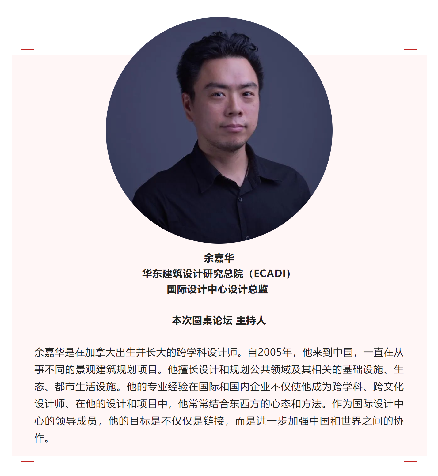 论坛中我们将中国的设计实践视为跨国家、跨学科和跨界的融合,与来自上海及国内各地的建筑、城市设计师、景观设计师和学者进行交流。在论坛现场,每位嘉宾都将展示他们最具代表性的作品,展示他们帮助中国实现未来生态保护、可持续发展和繁荣目标的方法。随后,会议将以圆桌讨论结束,讨论涉及当前社会、经济和政治环境的跨学科方法和挑战。