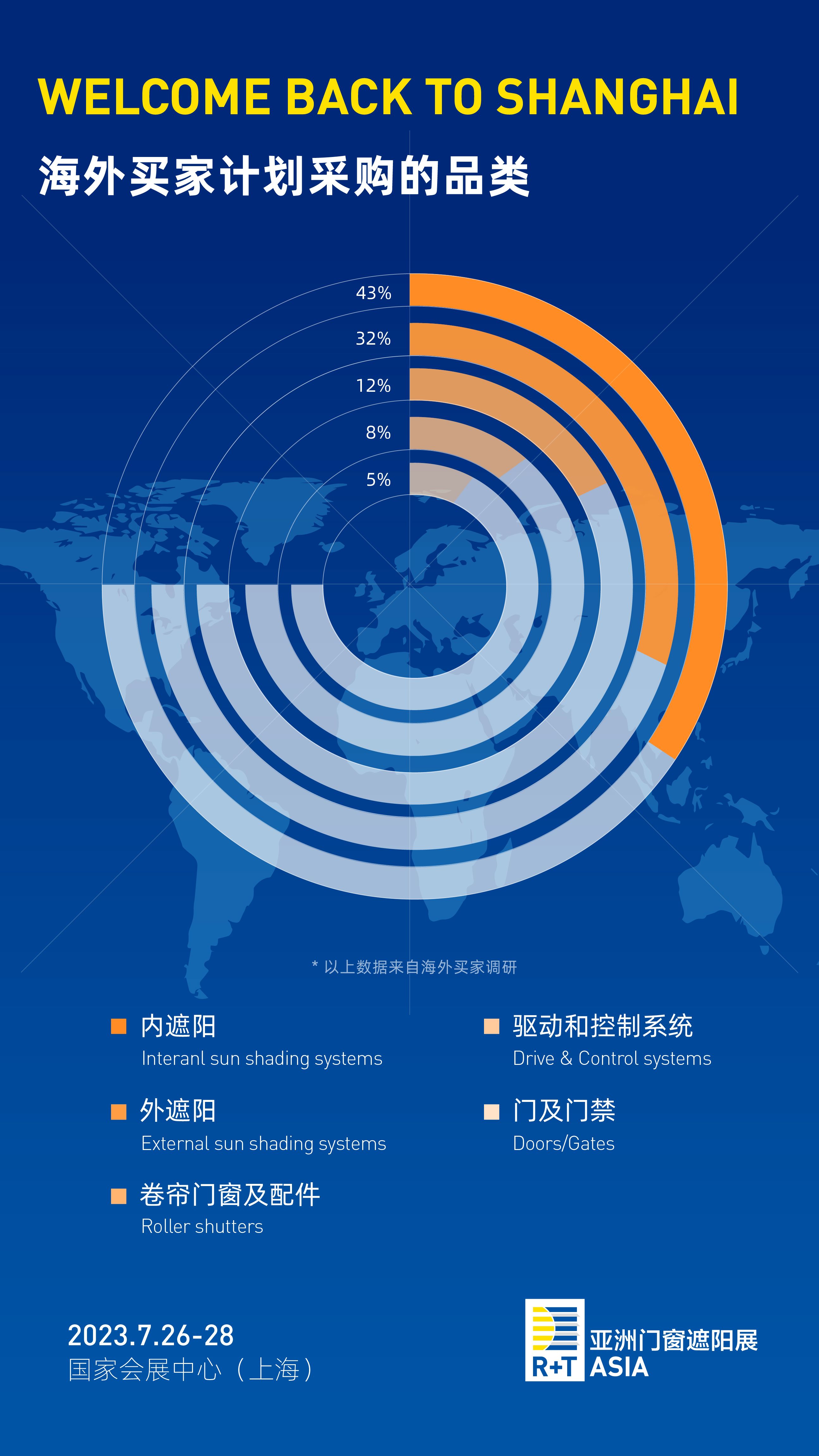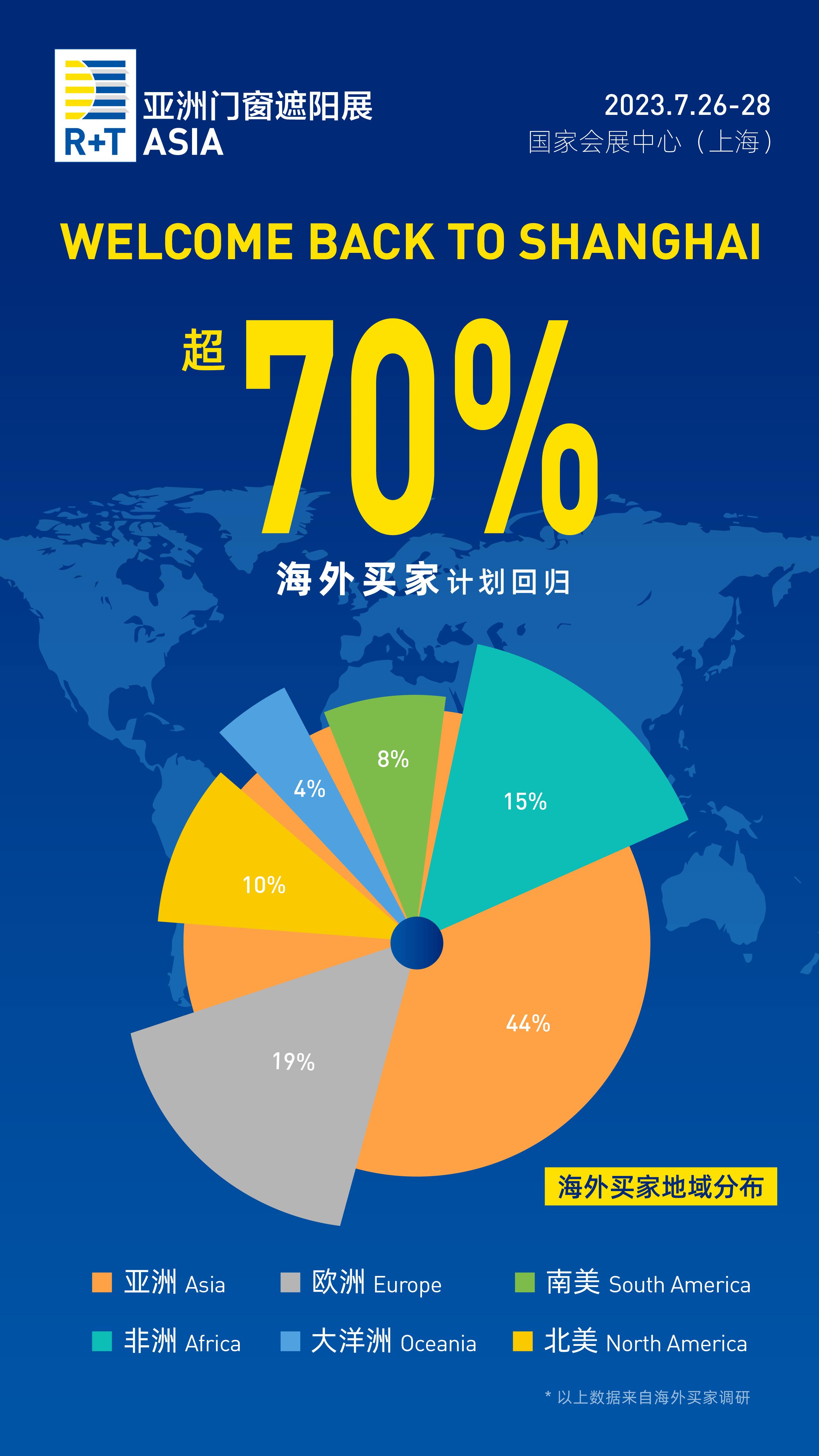 超七成海外买家 计划回归 *数据来源自R+T Asia历年海外观众市场调研 门窗遮阳企业 双向奔赴 2023 R+T Asia 亚洲门窗遮阳展将全力拓宽海外买家邀约渠道,迎接来自全球上百个国家和地区的千余名海外观众回归中国市场,助力门窗遮阳企业加速开拓海外市场。我们期待在7月上海,能够与众企业一起,共同迎接海外观众的回归! 与您七月上海见! 关于R+T Asia R+T Asia 多年来深耕门窗遮阳行业,始终与企业并肩前行。随着今年全球经济复苏,贸易回暖,作为门窗遮阳行业的绝佳商贸平台,R+T Asia将全新出发,全面升级产品功能,优化资源整合,更积极发挥门窗遮阳行业平台优势,助力企业出海,推动行业发展!期待您的参与! 您可关注官方微信公众号获取更多展会信息