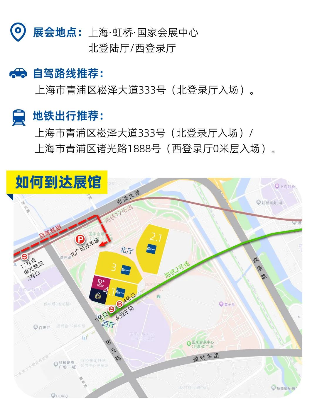 Main Entrances: National Exhibition and Convention Center (NECC Shanghai) North Entrance No. 333 Songze Avenue, Qingpu District, Shanghai, China