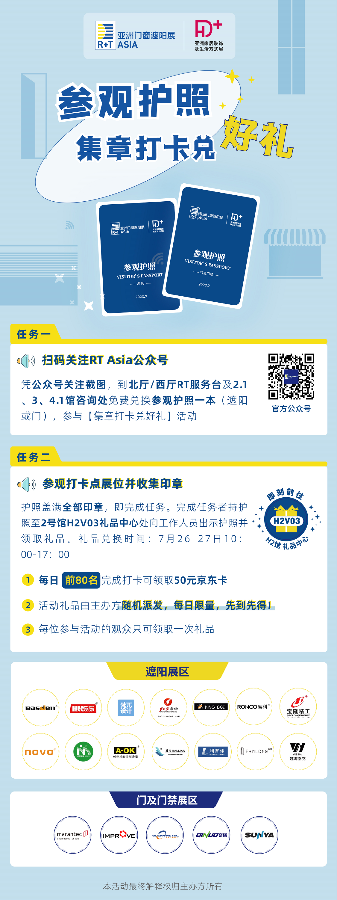 第十八届R+T Asia亚洲门窗遮阳展将于2023年7月26-28日,在上海虹桥·国家会展中心盛大开幕!本届R+T Asia将迎来来自全球逾13个国家及地区的近700家门窗遮阳知名品牌。同时,携手BUILD ASIA Mega Show亚洲建筑及装饰联展,共计300,000㎡展示面积、2500+参展品牌、13万+全产业链专业观众,打造集产业联动、工程集采、设计应用、国际商贸为一体的全产业链服务平台。我们在这诚挚邀请您,与我们共同见证这场全球门窗遮阳人的行业盛会!