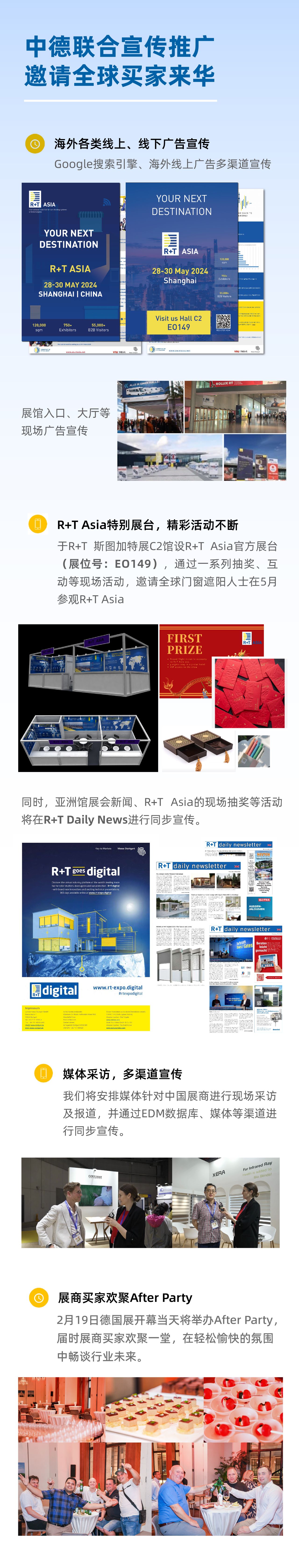2024年已经开启,我们也正式迎来中德联展年,1月11日起,国家移民管理局正式施行便利外籍人员来华5项措施,海外客商来华更畅通。R+T德国斯图加特展时隔6年于2月19-23日重磅回归,第十九届R+T Asia亚洲门窗遮阳展也将于5月28-30日在上海虹桥·国家会展中心举办。 2024R+T斯图加特展主题聚焦“可持续性”,吸引了逾千家全球门窗遮阳品牌,带来卷闸门、门、大门和遮阳系统领域的最新产品和服务。其中共有133家中国企业赴德参展,“中国制造”将进一步走向全球。点击查看R+T 斯图加特展 中国馆展商名单展商名录 中德联合宣传推广 为了更好的向全球展示亚洲市场最新动向,R+T Asia联合R+T 德国斯图加特展 ,特别推出“中德联合宣传推广计划”,通过一系列的推广行动,分享亚太市场信息、收集采购需求、交流行业发展,并广泛邀约海外买家参观5月上海虹桥R+T Asia。 「不是每个遮阳展 都叫R+T Asia」 2024.5.28-30 上海虹桥·国家会展中心 汇聚行业创新产品及发展趋势 更多精彩,敬请期待! 2024年展位热销中! 黄金展位所剩无几,拼手速先到先得!