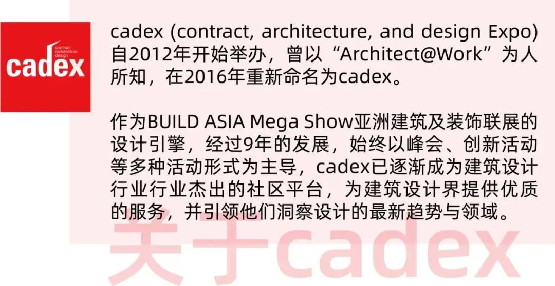 近年来,人们对居家及生活环境愈发重视,设计新生力量不断涌现。由于新冠疫情,2021年很多重要的设计活动受到了不同程度的影响。在2022年生机勃发的5月,R+T Asia将携手建筑设计年度盛宴——cadex建筑纪元再度回归,邀请国内外极具影响力的建筑师和设计师,共同交流全球前言设计趋势,为设计师们奉献一场高规格、高质量的设计盛宴。 cadex 2022将聚焦全球趋势及新材应用,以“重启•反弹”为主题,寓意后疫情时代,唤起了人们对于空间的可持续性思考。设计将突破传统,突破边界,在不确定性中探索最优方案,治愈疫情带来的焦虑和压抑,赋予空间新的活力。 cadex 2022建筑纪元峰会 大·有·乾·坤 更多重磅嘉宾 持续更新中...