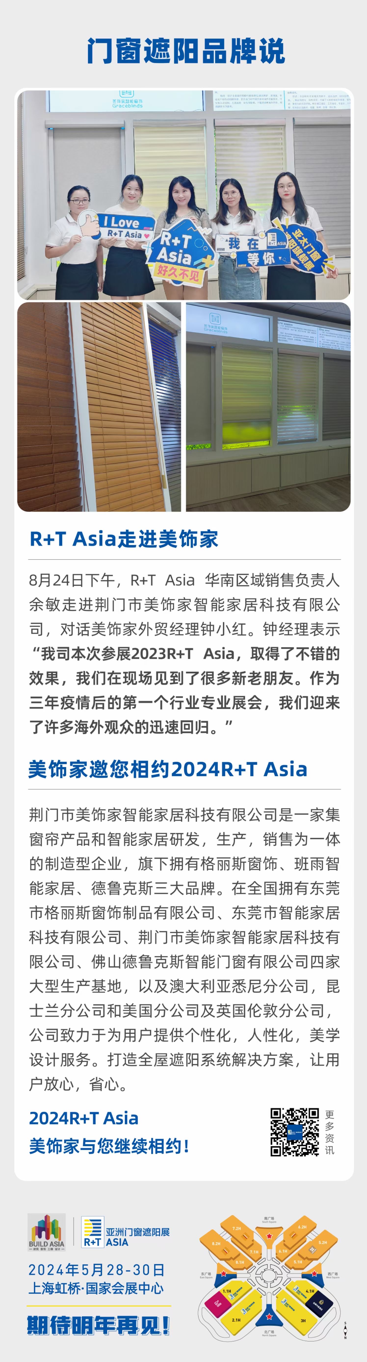 8月24日下午,R+T Asia 华南区域销售负责人余敏走进荆门市美饰家智能家居科技有限公司,对话美饰家外贸经理钟小红。钟经理表示“我司本次参展2023 R+T Asia,取得了不错的效果,我们在现场见到了很多新老朋友。作为三年疫情后的第一个行业专业展会,我们迎来了许多海外观众的迅速回归。”