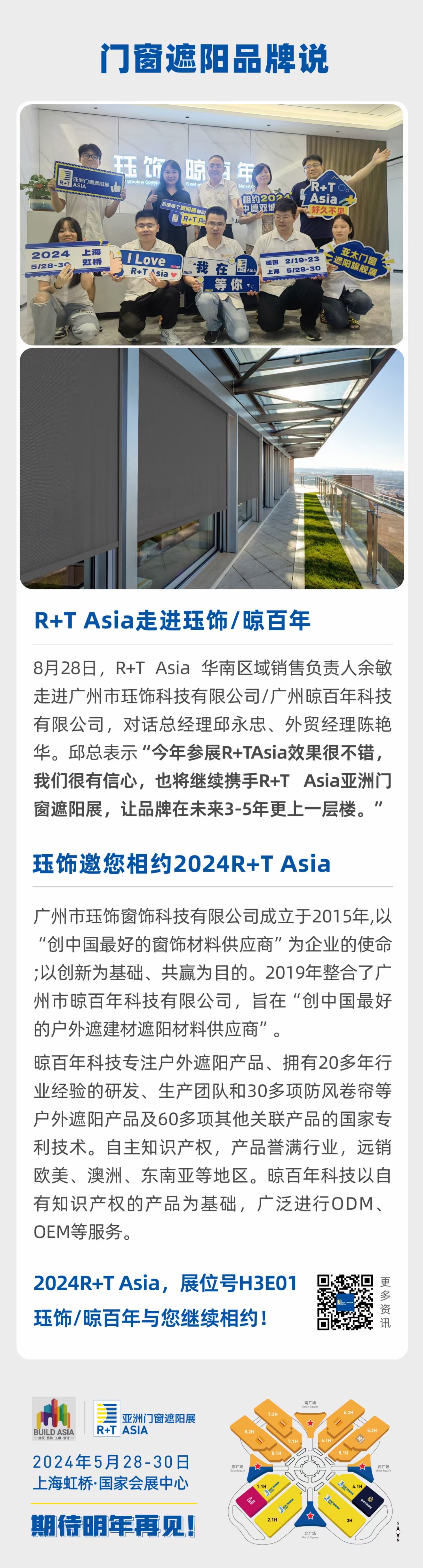 8月28日,R+T Asia 华南区域销售负责人余敏走进广州市珏饰科技有限公司/广州晾百年科技有限公司,对话总经理邱永忠、外贸经理陈艳华。邱总表示“今年参展R+TAsia效果很不错我们很有信心,也将继续携手R+T Asia亚洲门窗遮阳展,让品牌在未来3-5年更上一层楼。”
