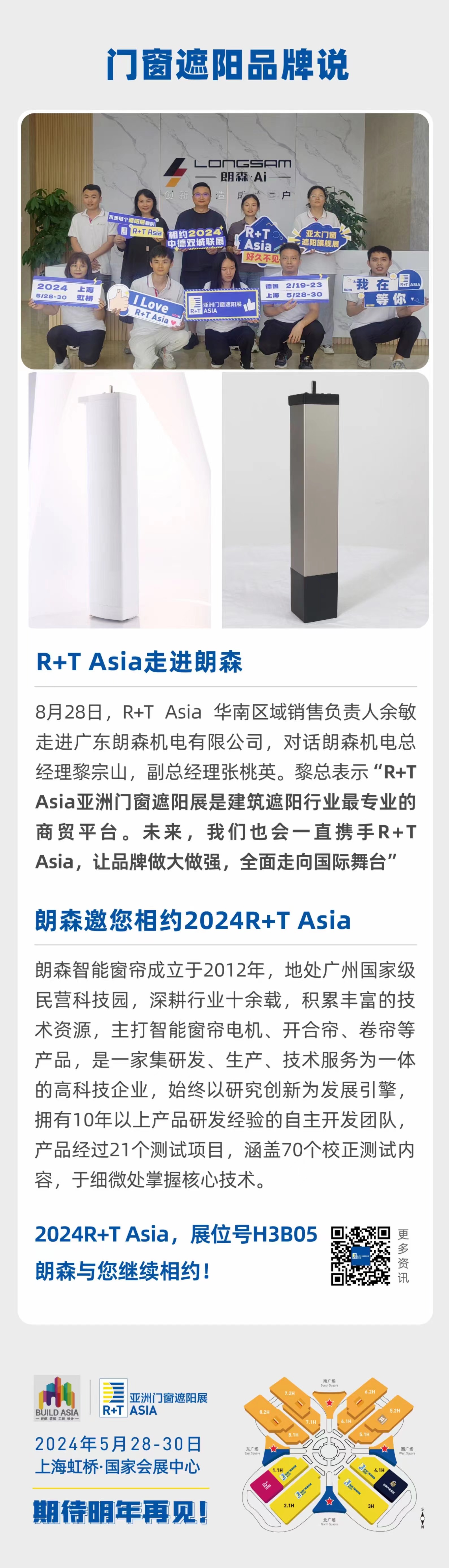 8月28日,R+T Asia 华南区域销售负责人余敏走进广东朗森机电有限公司,对话朗森机电总经理黎宗山,副总经理张桃英。黎总表示“R+TAsia亚洲门窗遮阳展是建筑遮阳行业最专业的商贸平台。未来,我们也会一直携手R+TAsia,让品牌做大做强,全面走向国际舞台。“