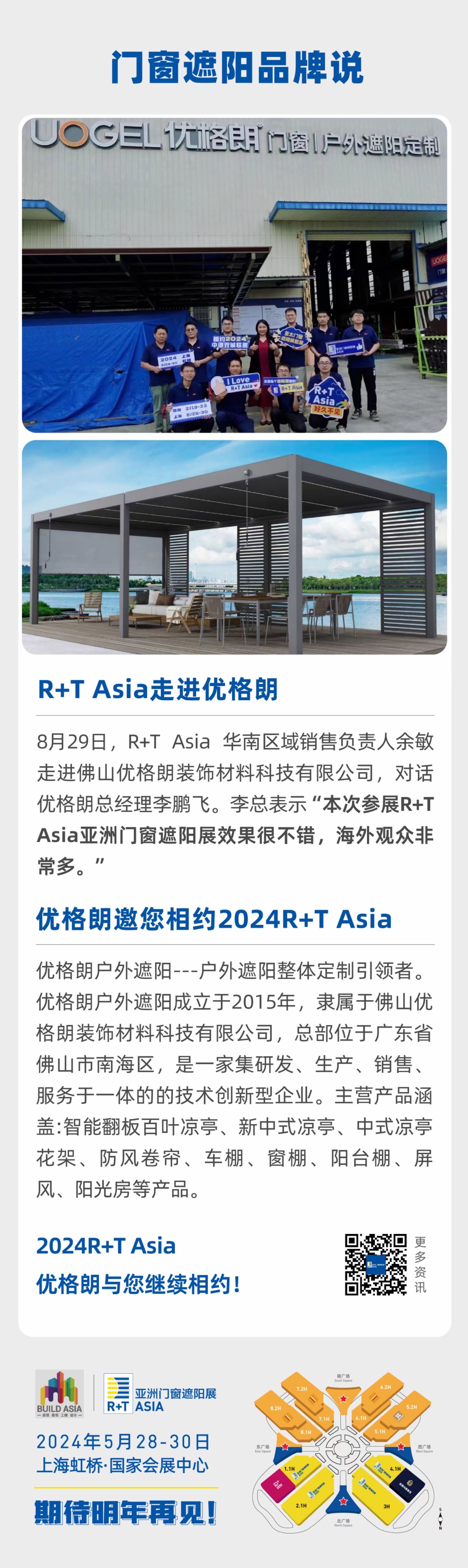 8月29日,R+T Asia 华南区域销售负责人余敏走进佛山优格朗装饰材料科技有限公司,对话优格朗总经理李鹏飞。李总表示“本次参展R+TAsia亚洲门窗遮阳展效果很不错,海外观众非常多。“