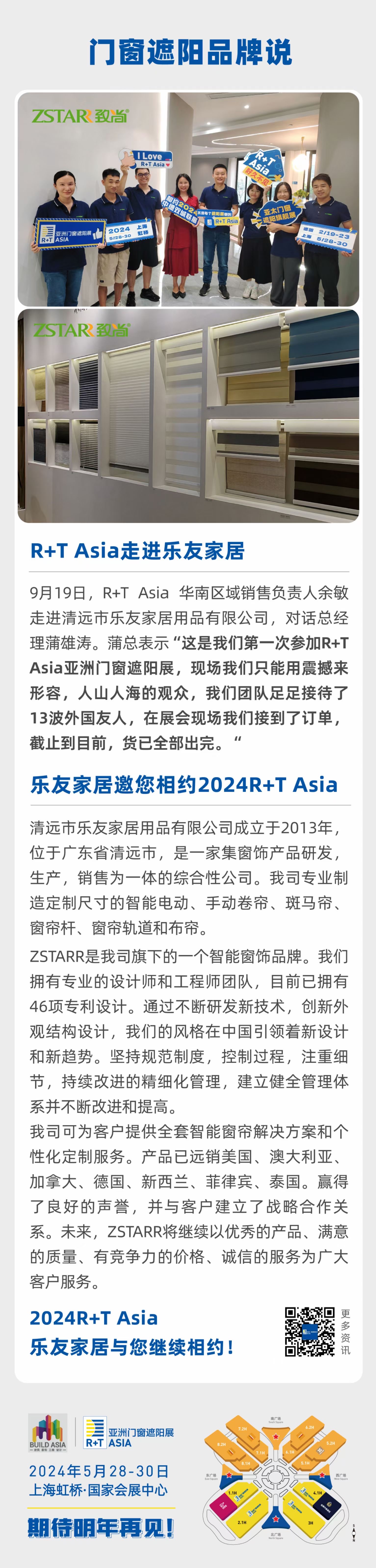 9月19日,R+T Asia 华南区域销售负责人余敏走进清远市乐友家居用品有限公司,对话总经理蒲雄涛。蒲总表示“这是我们第一次参加R+T Asia亚洲门窗遮阳展,现场我们只能用震撼来形容,人山人海的观众,我们团队足足接待了13波外国友人,在展会现场我们接到了订单,截止到目前,货已全部出完。”