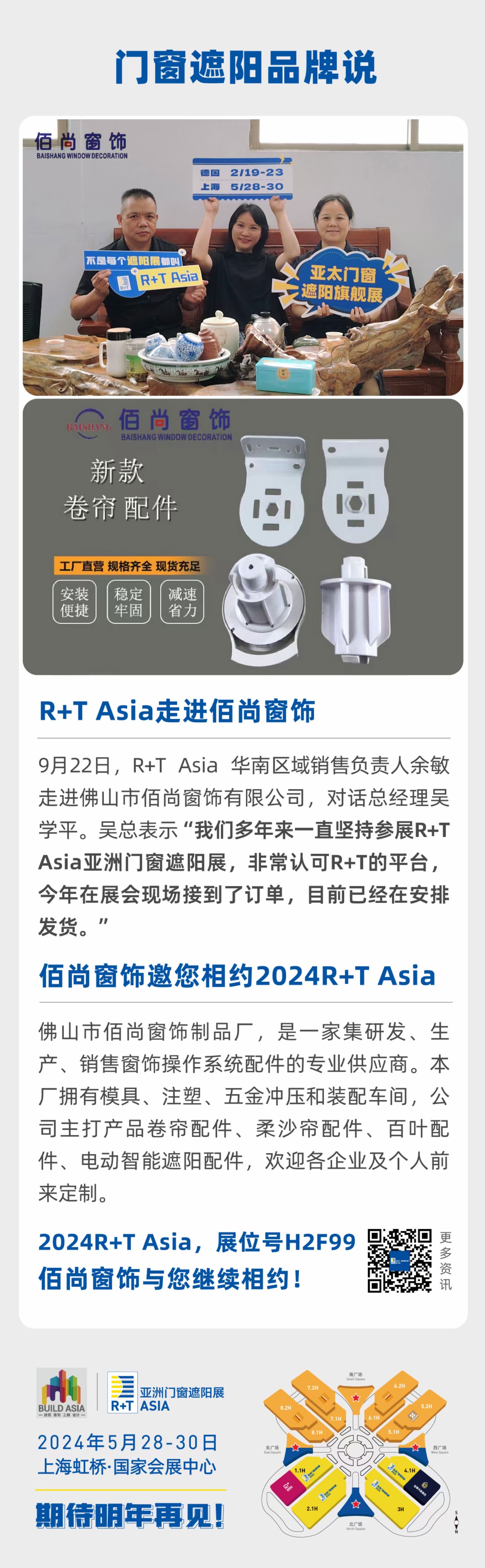9月22日,R+T Asia 华南区域销售负责人余敏走进佛山市佰尚窗饰有限公司,对话总经理吴学平。吴总表示“我们多年来一直坚持参展R+T Asia亚洲门窗遮阳展,非常认可R+T的平台今年在展会现场接到了订单,目前已经在安排发货。”