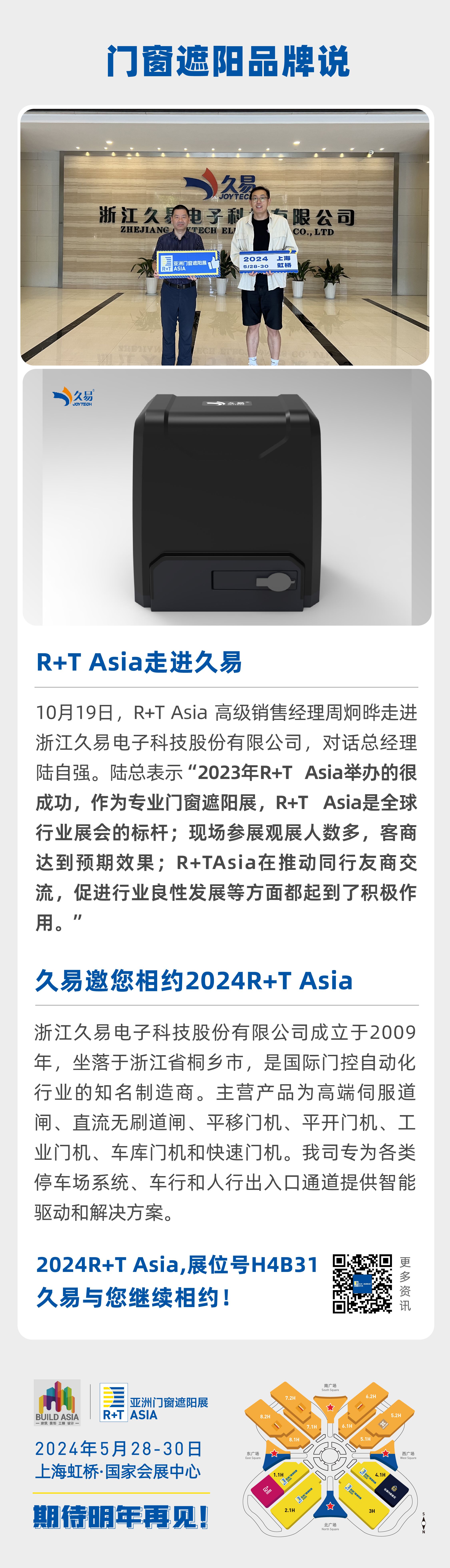 10月19日,R+T Asia 高级销售经理周炯晔走进浙江久易电子科技股份有限公司,对话总经理陆自强。陆总表示“2023年R+T Asia举办的很成功,作为专业门窗遮阳展,R+T Asia是全球行业展会的标杆:现场参展观展人数多,客商达到预期效果;R+T Asia在推动同行友商交流,促进行业良性发展等方面都起到了积极作用。”