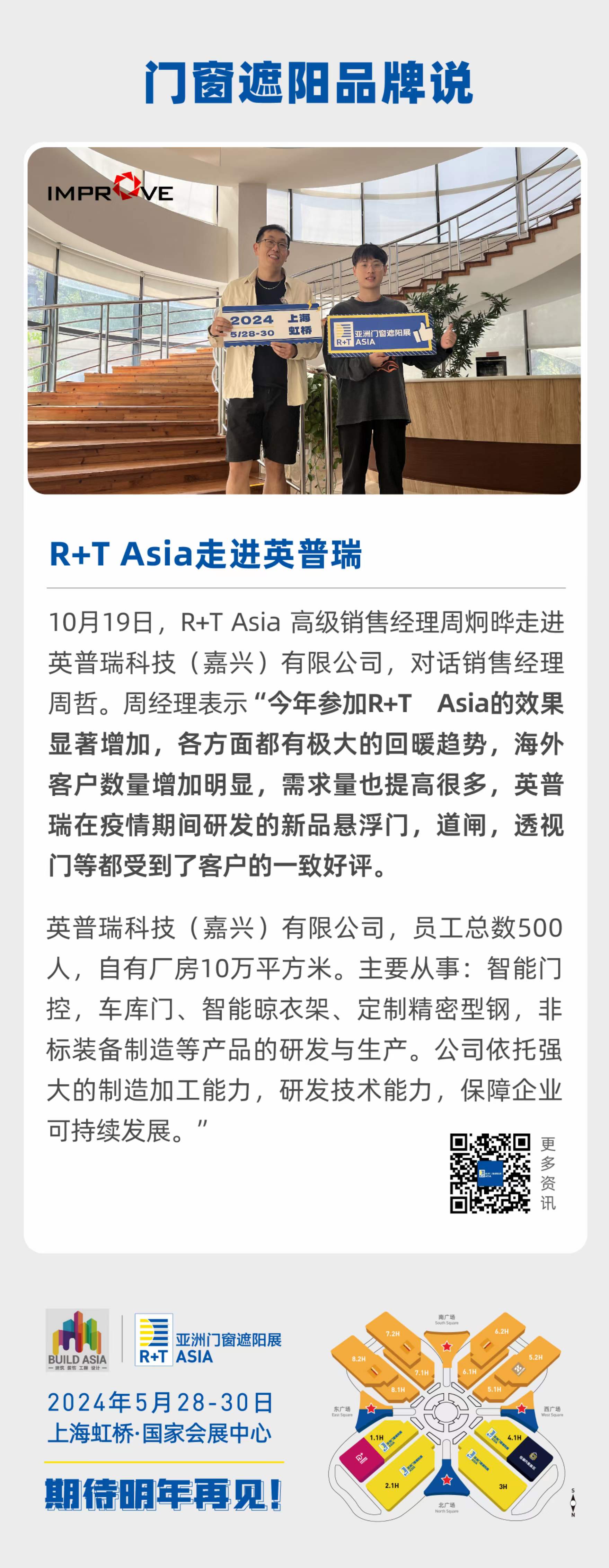 近日,R+T Asia 高级销售经理周炯晔走进英普瑞科技(嘉兴)有限公司,对话销售经理周哲。周经理表示“今年参加R+T Asia的效果显著增加,各方面都有极大的回暖趋势,海外客户数量增加明显,需求量也提高很多,英普瑞在疫情期间研发的新品悬浮门,道闸,透视门等都受到了客户的一致好评。”
