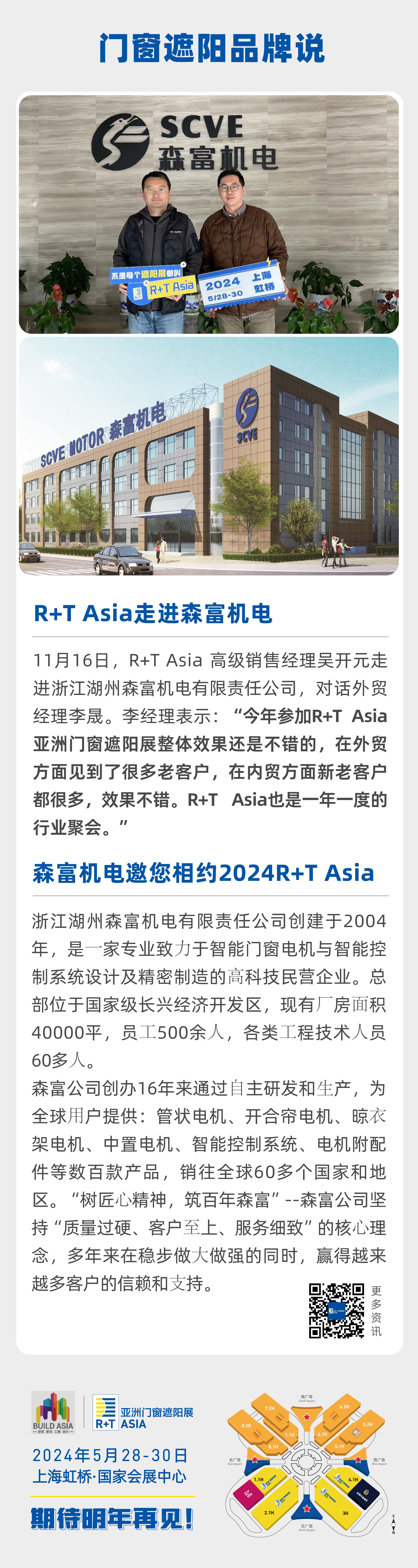 近日,11月16日,R+T Asia 高级销售经理吴开元走进浙江湖州森富机电有限责任公司,对话外贸经理李。李经理表示:“今年参加R+T Asia亚洲门窗遮阳展整体效果还是不错的,在外贸方面见到了很多老客户,在内贸方面新老客户都很多,效果不错。R+T Asia也是一年一度的行业聚会。”