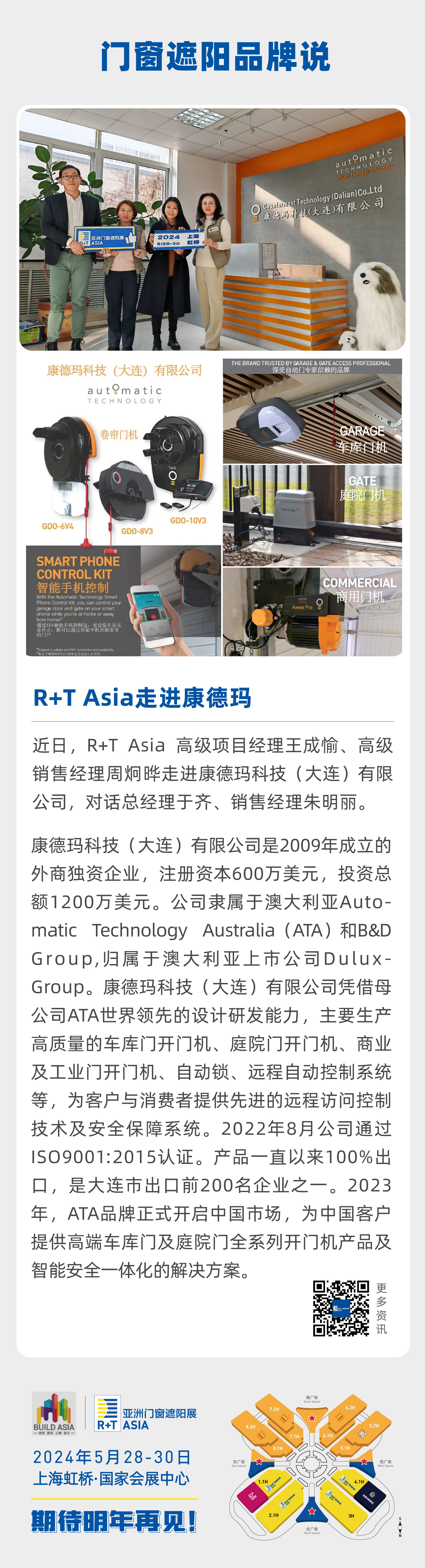 康德玛科技(大连)有限公司是2009年成立的外商独资企业,注册资本600万美元,投资总额1200万美元。公司隶属于澳大利亚Automatic Technology Australia (ATA)和B&DGroup,归属于澳大利亚上市公司Dulux-Group。康德玛科技 (大连)有限公司凭借母公司ATA世界领先的设计研发能力,主要生产高质量的车库门开门机、庭院门开门机、商业及工业门开门机、自动锁、远程自动控制系统等,为客户与消费者提供先进的远程访问控制技术及安全保障系统。2022年8月公司通过S09001:2015认证。产品一直以来100%出,是大连市出口前200名企业之一。2023年,ATA品牌正式开启中国市场,为中国客户提供高端车库门及庭院门全系列开门机产品及智能安全一体化的解决方家。