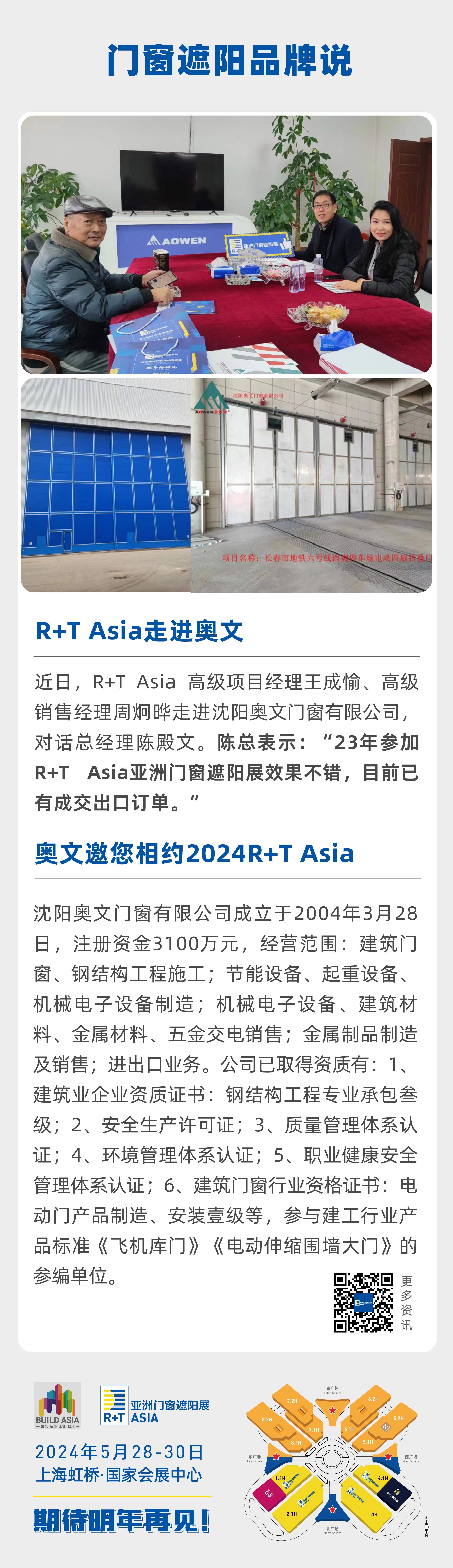 近日,R+T Asia 高级项目经理王成愉、高级销售经理周炯晔走进沈阳奥文门窗有限公司对话总经理陈殿文。陈总表示:“23年参加R+T Asia亚洲门窗遮阳展效果不错,目前已有成交出口订单。”